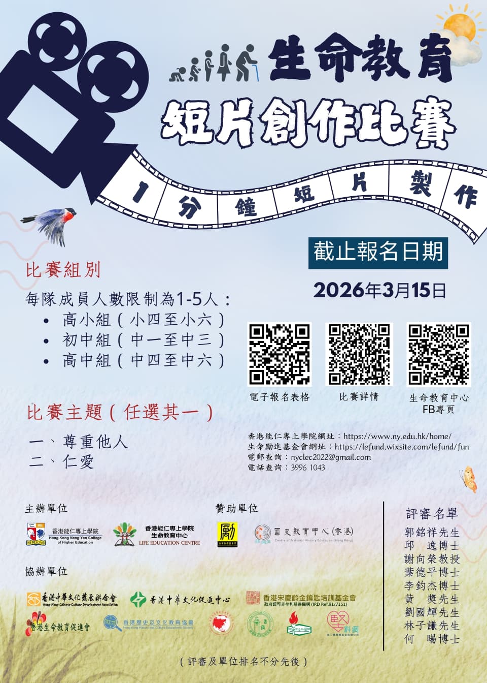 由「香港能仁專上學院生命教育中心」主辦,「生命勵進基金會」與「國史教育中心」贊助,以及 「香港宋慶齡金鑰匙培訓基金會」等多個單位協辦的「生命教育短片創作比賽」,現正接受報名, 敬請踴躍參加!🌟